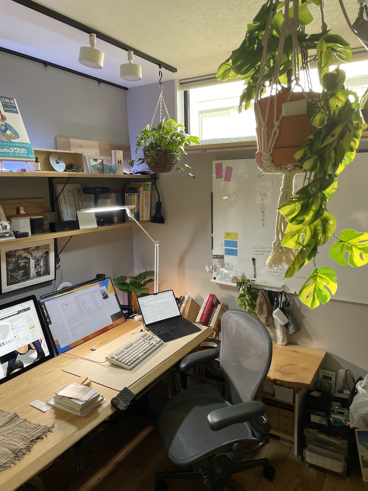 チェアは引き続きハーマンミラーのアーロンチェア。前のミラ2チェアが壊れたので仕方なく!買うことに。100周年記念とかで2割引でした。ミラ2チェアの方は12年保証の11年目だったので無償で修理してもらったのですが、半年近くかかってうーん、という感じ。アーロンチェアが届くまではダイニングチェアでしのいでました。