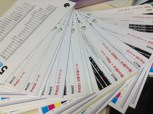 はがきくらいの大きさで、上質紙、コート紙、マットコート紙といった僕でも聞いたことがあるような有名所から、ガルバスCoCとかナニソレ?な紙まで、いろいろな紙が束ねられています。たぶん、200枚くらい。こんなの。