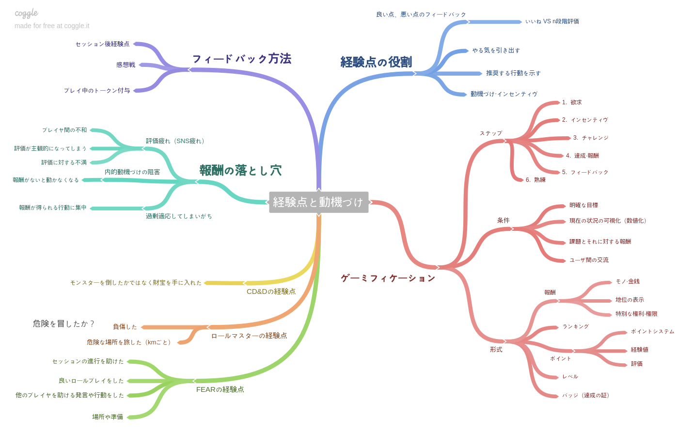 近年、教育やビジネスの分野で注目を浴びている、生徒や社員のモチベーションを上げたり行動をとらせる手法に「ゲーミフィケーション」があります。ゲーム内ゲーミフィケーションということになりますが、TRPGの報酬を設計する上でも、ゲーミフィケーションの研究が参考になるかと思います。……思うのですが、あまり真面目にこの分野の勉強はしたことがないので、簡単に紹介するに留めます。すみません。また別の機会にもうちょっとしっかり取り上げてみたいと思います。